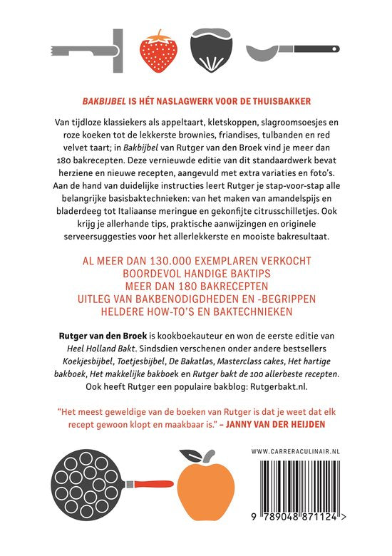 De Bakbijbel biedt meer dan 180 vernieuwde en klassieke bakrecepten, van appeltaart en roze koeken tot brownies, tulbanden en red velvet taart. Deze herziene editie bevat nieuwe recepten, extra variaties en frisse fotografie. Met duidelijke stap-voor-stap instructies leer je alle essentiële baktechnieken, zoals het maken van amandelspijs, bladerdeeg en Italiaanse meringue. Daarnaast ontdek je handige tips, praktische aanwijzingen en creatieve serveersuggesties. De Bakbijbel is hét standaardwerk voor iedereen die het beste bakresultaat wil behalen.